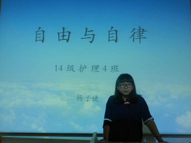 演讲开始,14级护理2班的夏群睿结合自身经历与现实中的事例向同学们讲述了她眼中的“自由与自律”,讲座举例贴近实际,赢得了同学们的共鸣。随后是14级护理4班杨子婕进行演讲,她灵活运用风筝和线的例子启示我们应该找到属于自己的自由,成为一个拥有自律的自由者。15级老年护理班杨云梅同学的演讲告诉我们要想真正自由就是要学会自律,我们需要养成良好的自律习惯。