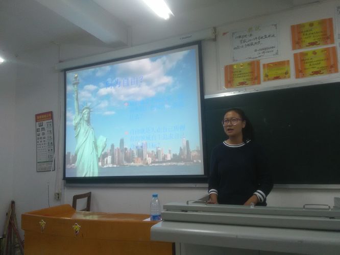 主持人宣布活动开始时,同学们依次上台演讲,在台上她们镇定自若,一一将自己对“自由与自律”的认识与理解、感悟与思考与同学进行了分享。她们认为:自由是自律的最高目标,不管在任何时候做任何事情,我们都渴望自由,但也要学会自律。自由离不开自律,自律保障我们的行为,唯有严于律己的人,才能享受工作的自由,生活的自由,做人的自由。有选手说过这样一句话:“如若你想征服全世界,你就得先征服自己;如若你想自由的翱翔,你就必须先保护好自己的双翼”。