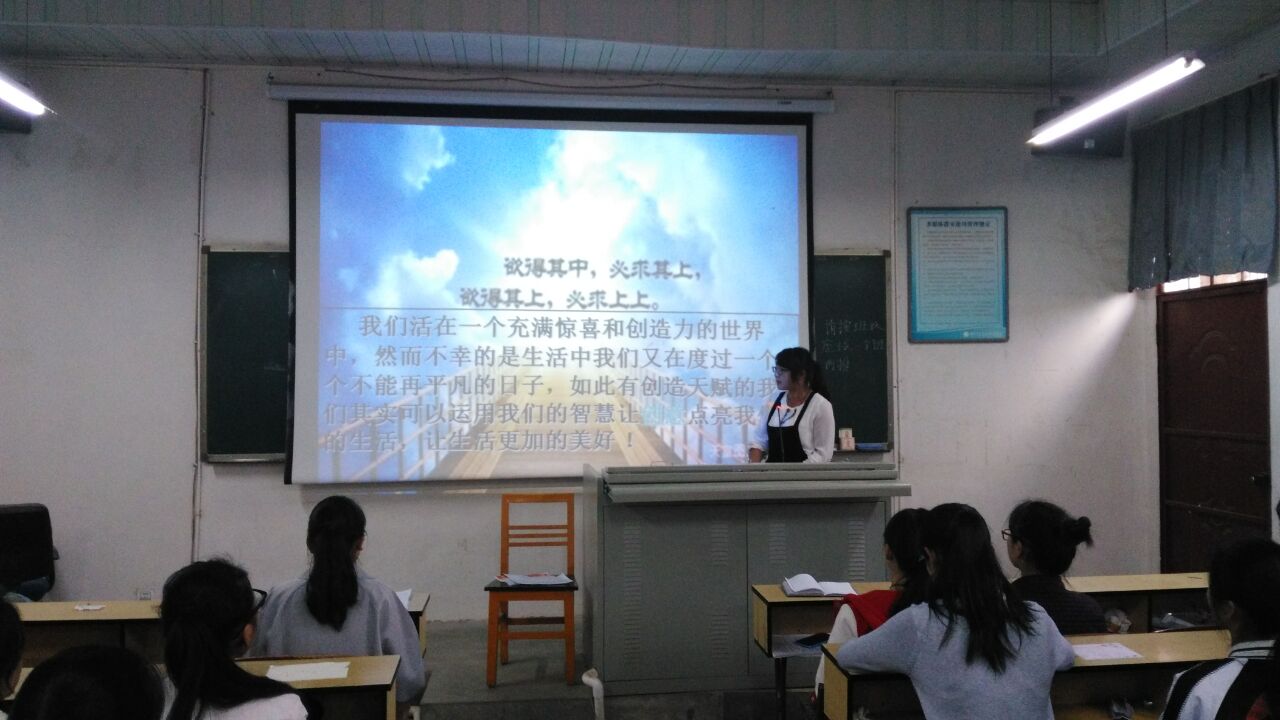 我们生活在一个充满惊喜和创造力的世界中,然而不幸的是生活中我们又在度过一个个不能再平凡的日子,如此有创造天赋的我们其实可以运用我们的智慧让创意点亮我们的生活,让生活更加的美好。演讲中同学们表现精彩,选手分别阐述了她们对创意的理解,用生动经典的创意之例突出了讲座的主题“创意,让生活更美好”。